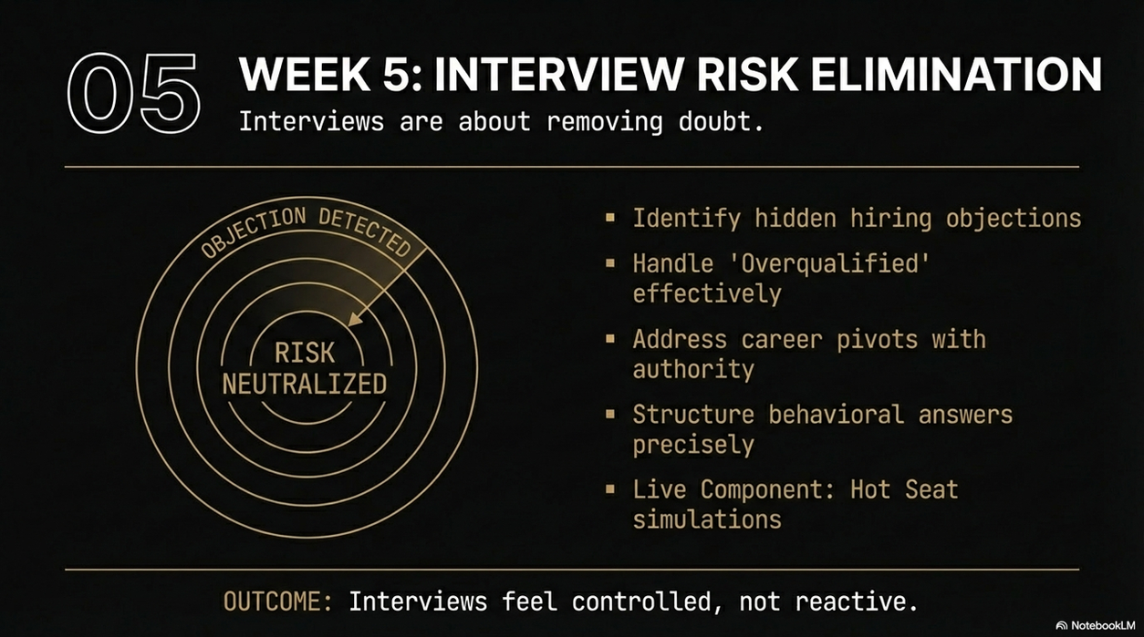 The Offer Lab is a 6-week group career operating system designed to eliminate doubt, clarify your positioning, and help you close the offer with authority.
